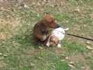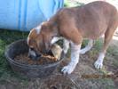 He gets along very well with other dogs. As you can see from his pictures, he's quite a good 'puppy-sitter'. As a matter of fact, he gets along too darn well with other dogs. Instead of running off stray dogs (as any good country dog should!), Cowboy goes out and finds stray dogs and brings them home!