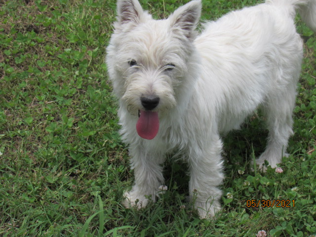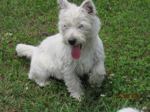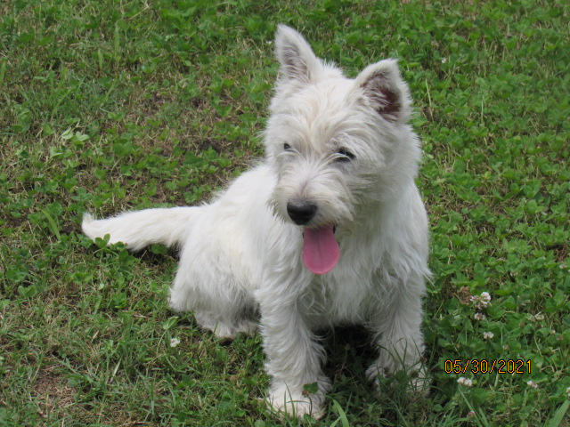 We all laugh on the farm about how appropriately Eartha is named because she LOVES the earth! Her Scottish ancestors would be proud of how much she enjoys digging and rolling! She is a TRUE Westie!! She is such a happy and playful girl, but she is also very sweet and loving. She's an absolute delight to have on the farm!