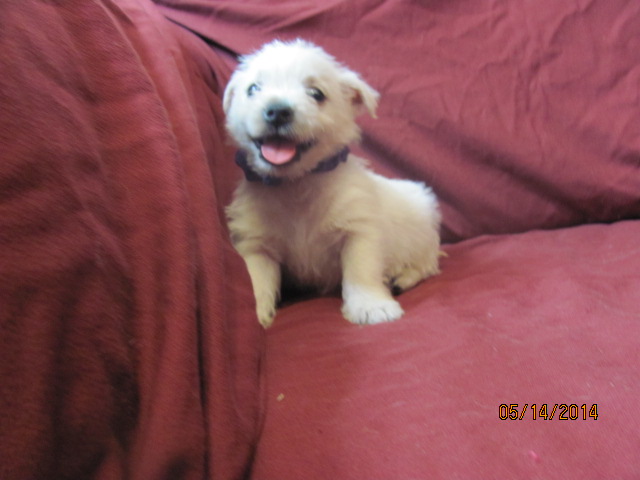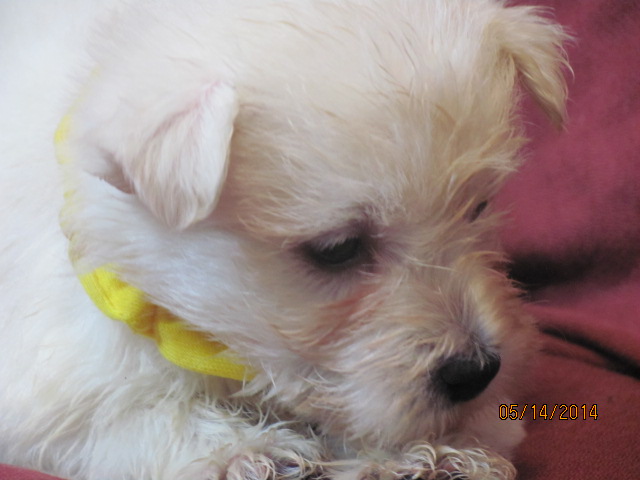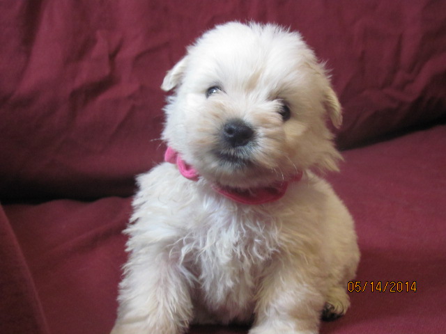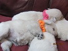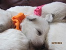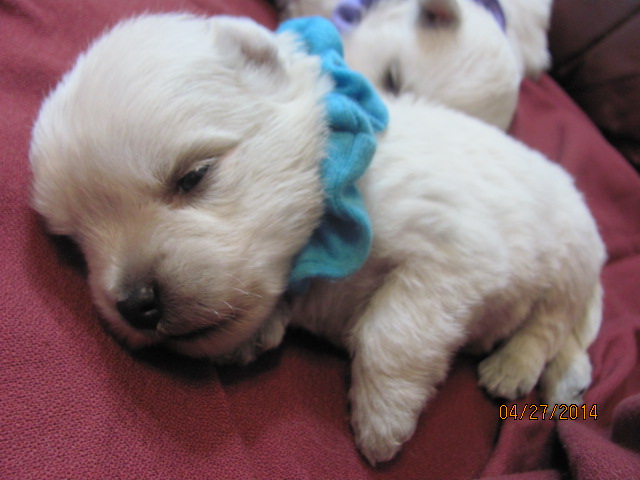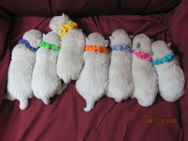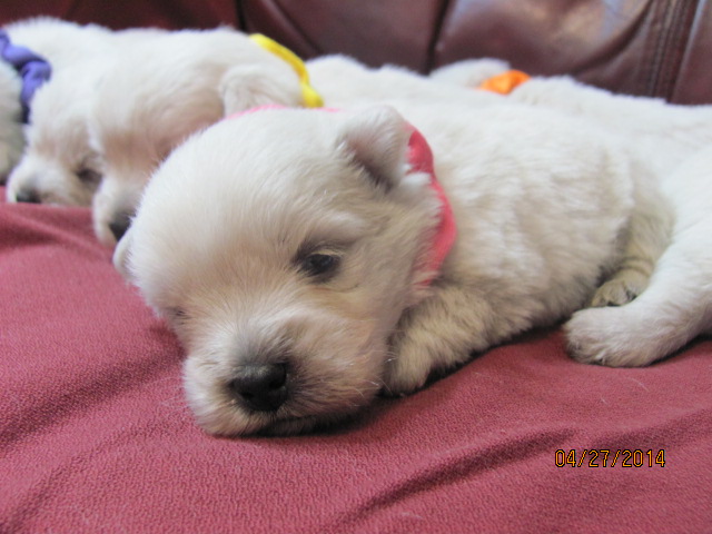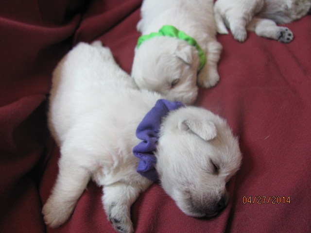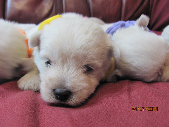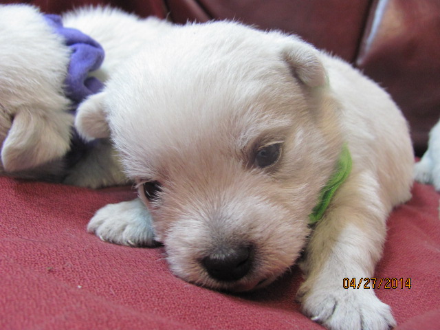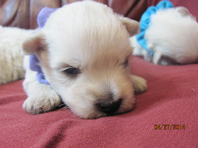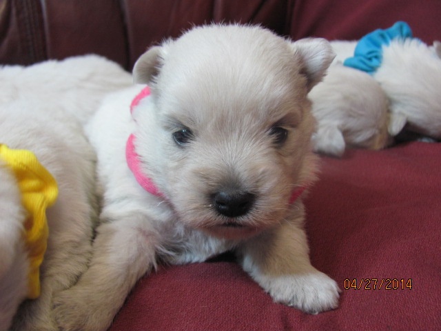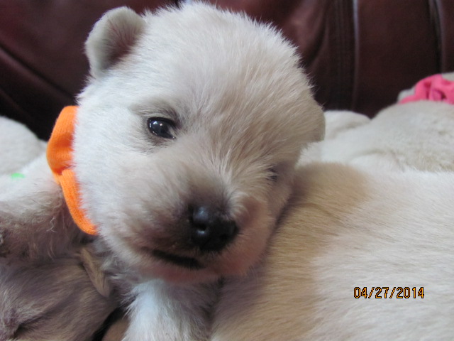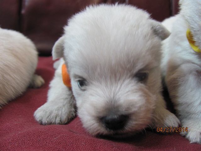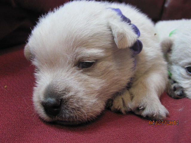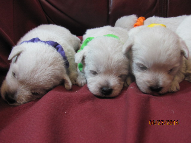 My sweet little Peigi and her handsome Scottish lad, Gerard, are the proud new parents of 7 wonderfully beautiful little Westie babies 6 girls and 1 boy! The puppies were born on April 03, 2014 and will be ready to travel to their new furrever homes on May 29, 2014. Please click on the pictures of the puppies to see larger pictures, click on the parents' pictures to go visit their pages and find links to their pedigrees. You can also see the videos of this litter of exceptionally beautiful Westie puppies playing, or see videos of the previous comedy troup playing ... or have fun watching the videos of last year's litter or the videos of yet another litter, 3 beautiful little girls .