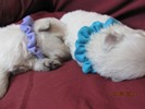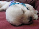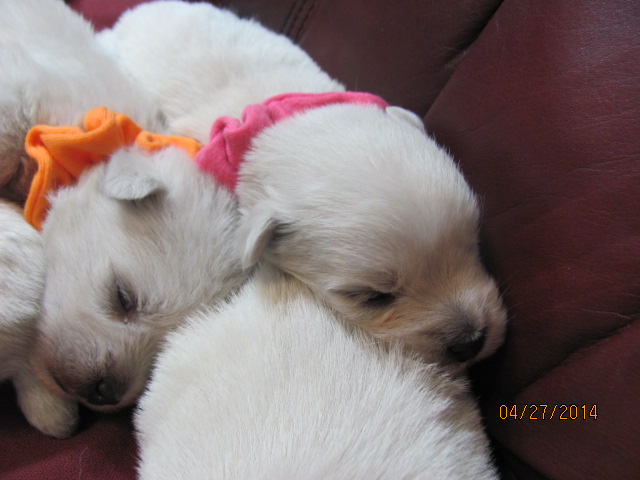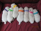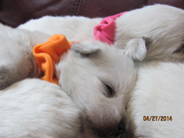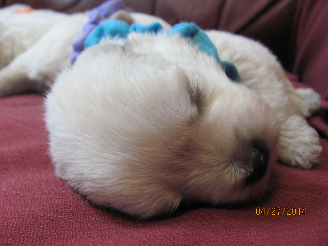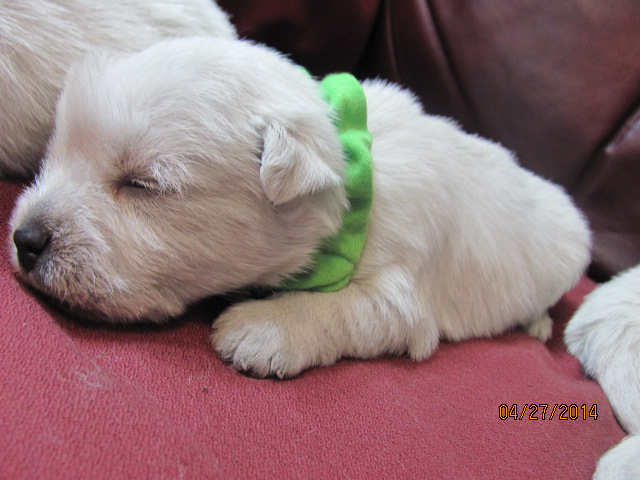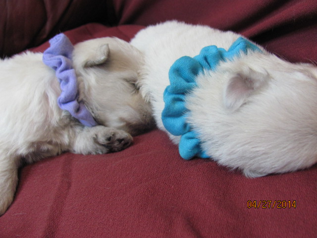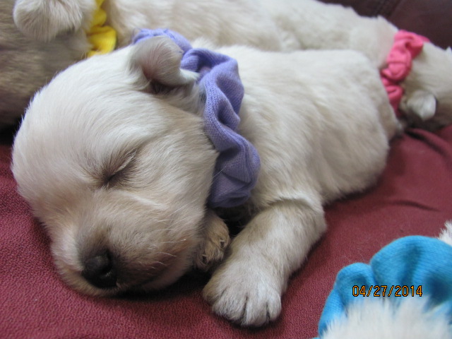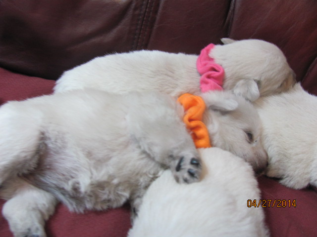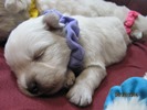 The puppies are named according to the ribbon they are wearing. The puppies are listed in order of gender, then size. Girls are listed first, from the largest girl to the smallest girl, then boys are listed from largest to smallest. If a puppy is spoken for, there will be a family's description beside the puppy's name.