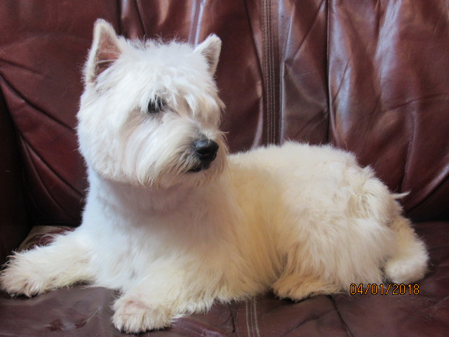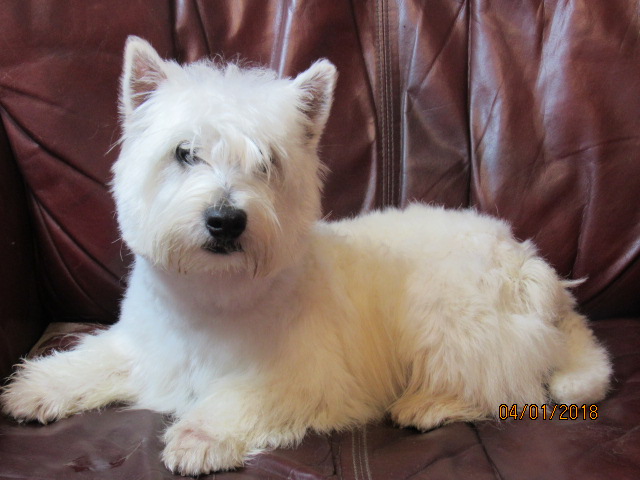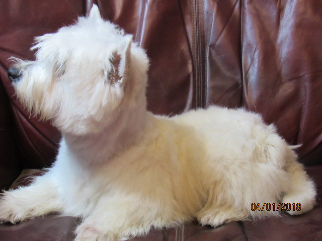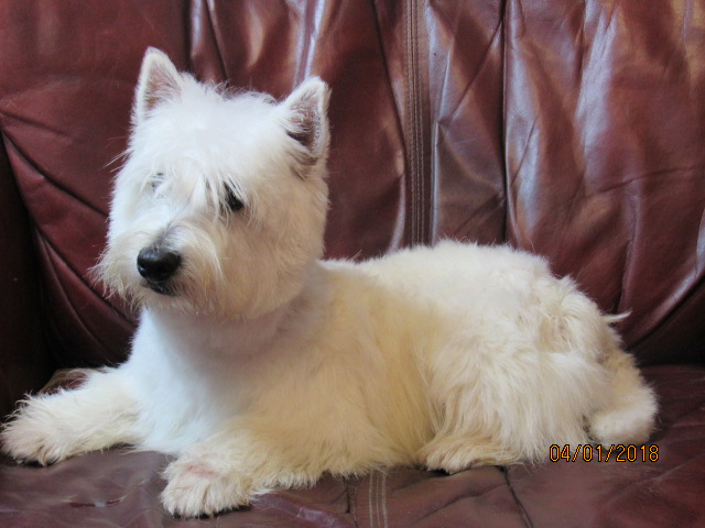 Malcolm's mother, Mandee, is the daughter of LilChit and Tristin, and the full sibling to Andee, Gael, Bader, Hillary, Rhoswen, Suisan, Skye, MacTristin, and Suzie. (I obviously like to keep the off spring of LilChit and Tristin!) LilChit is the youngest daughter of Skeezer and Murphy, my original Westies. If you go to Tristin's, Skeezer's, and Murphy's pages, you will find their 5 generation pedigrees, which will, ofcourse, give you a many-generation pedigree for Malcolm.