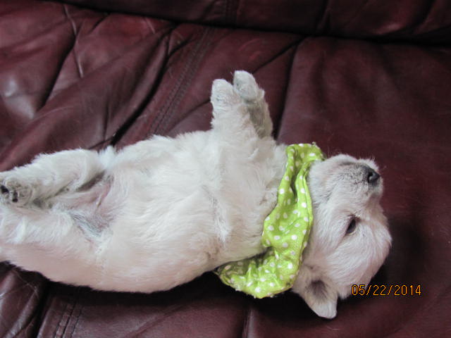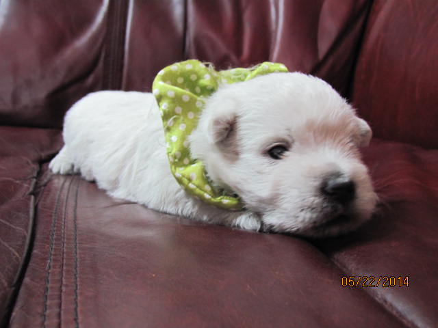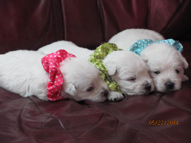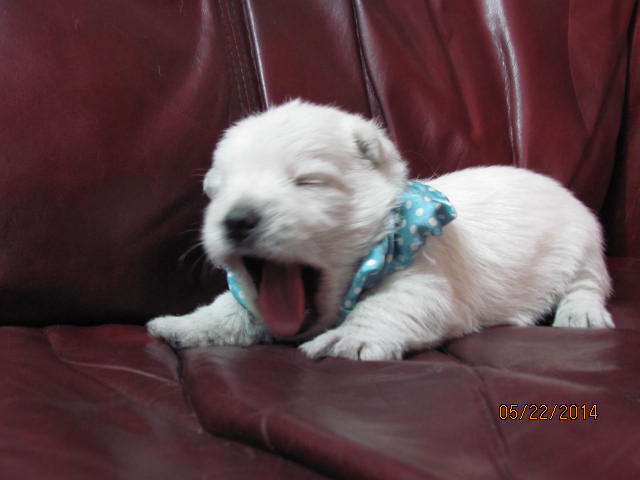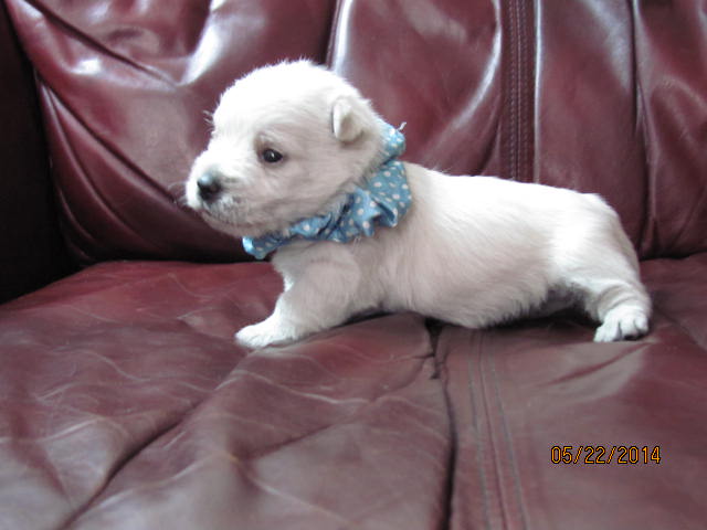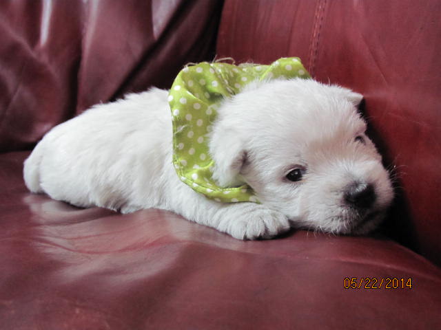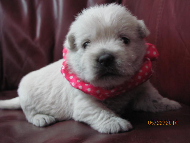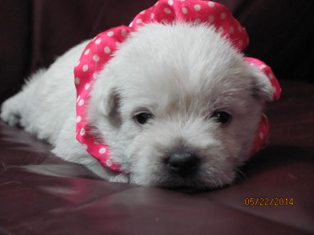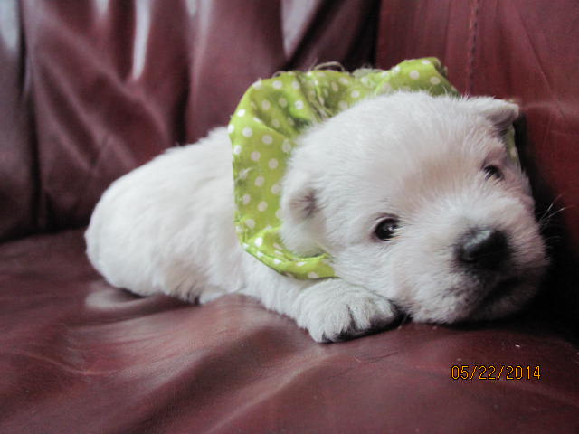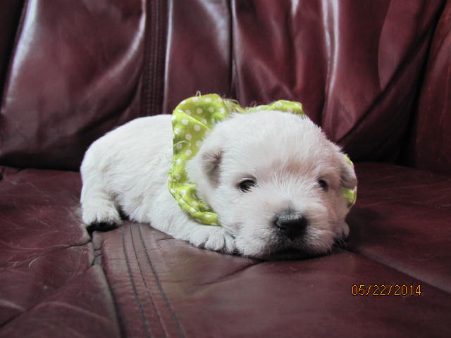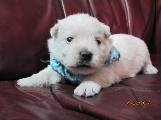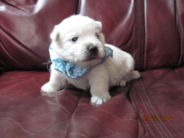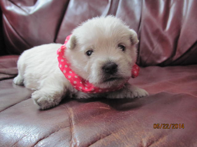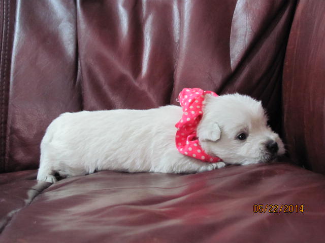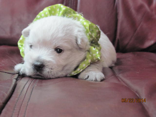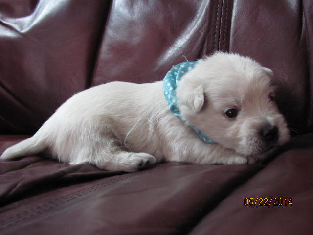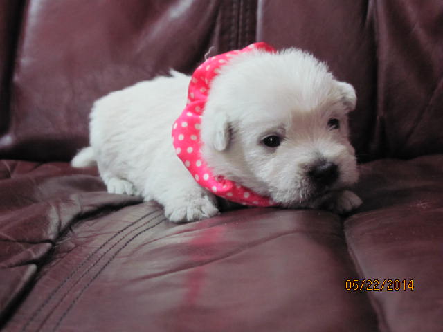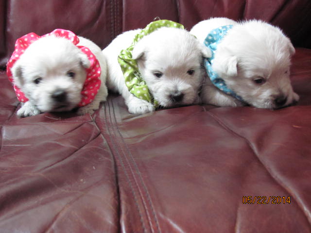 Welcome to the page of LilChit's beautiful Westie babies! The puppies were born on May 01, 2014 and will be 8 weeks old and ready for their new homes on June 26, 2014. There are 3 puppies in total, 1 girl and 2 boys.